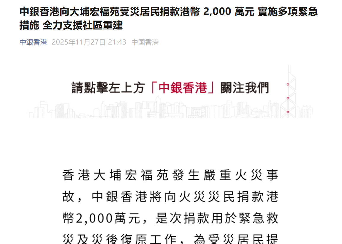 11月27日,中国银行(香港)有限公司发布公告称,中银香港将向火灾灾民捐款港币2,000万元,本次捐款用于紧急救灾及灾后复原工作,为受居民提供紧急经济支援。中银香港向不幸遇难的同胞致以深切哀悼,向伤亡者家属表示诚挚慰问,向消防及救援人员致以崇高的敬意。